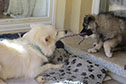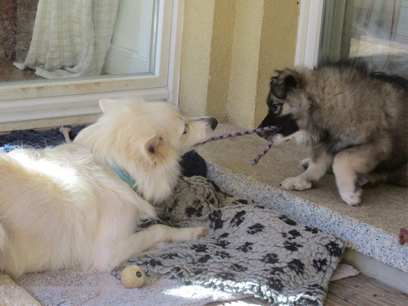 Dargo ist als letzter ausgezogen und so hat er die tolle Erfahrung machen dürfen, Mama Annabelle 14 Tage lang alleine für sich zu haben. Toben, toben, toben, das war ihre Lieblingsbeschäftigung. Doch daneben konnte ich Dargo auch schon viel vom alltäglichen Leben zeigen, viele Autos, fremde Menschen, fremde Hunde, dunkle Straßen, Straßenlärm, Einkaufszentrum. Es waren alles sehr starke Eindrücke für den kleinen Hund, die er aufmerksam und erstaunlich ruhig auf sich hat einwirken lassen, eine Charaktereigenschaft, die mich begeistert hat und die auch seine neue Familie immer wieder erstaunen lässt. Dargo ist umgetauft worden, er heißt jetzt Dai-go.